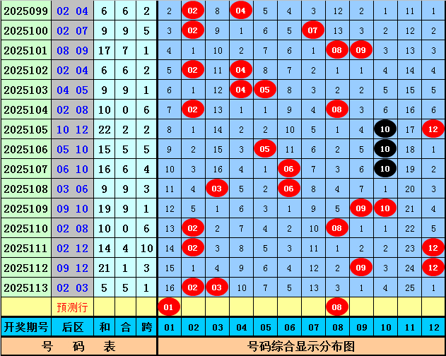 后区分析:上期开出后区奖号02+03,为一奇一偶组合,后区最近10期全奇、全偶和一奇一偶组合分别开出0次、5次和5次,本期后区防一奇一偶组合再出,参考号码01、08。