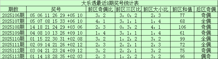 大乐透第2025113期奖号为:前区:01、14、18、28、35,后区:02、03。其中前区奇偶比为2:3,大小比为3:2,三区比为1:2:2,和值为96。