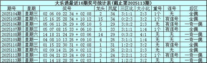 大乐透第2025113期奖号为:01、14、18、28、35+02、03。其中前区三区比为1:2:2,大小比为3:2,没有出现重号,没有出现连号,后区为一奇一偶号码。