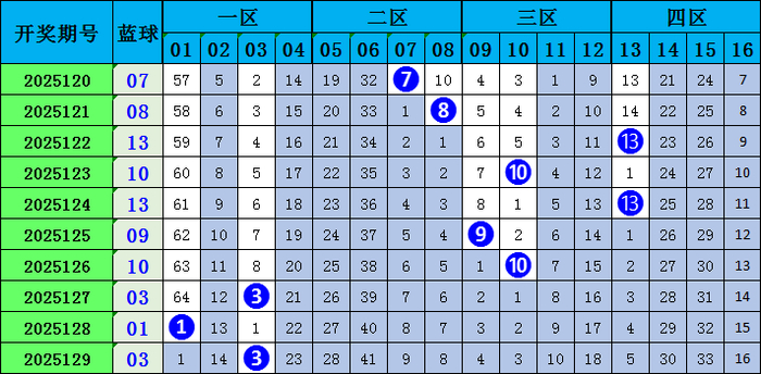 红二区(12-22):上期该区出2个13、20,上周二该区开出3奖号15、17、19,最近10期该区开出21个奖号,最近10期星期二该区出现6奖号,近10期断区2次,近10期星期二断区1次,本期注意该区落号,排除断档。最近10期该区奇偶比为12:9,其中星期二分别开出奇偶比为0:0、2:1、3:0,奇数号码相对热出。最近10期星期二该区号码012路比为3:2:1,本期该区重点关注2码:16、20。