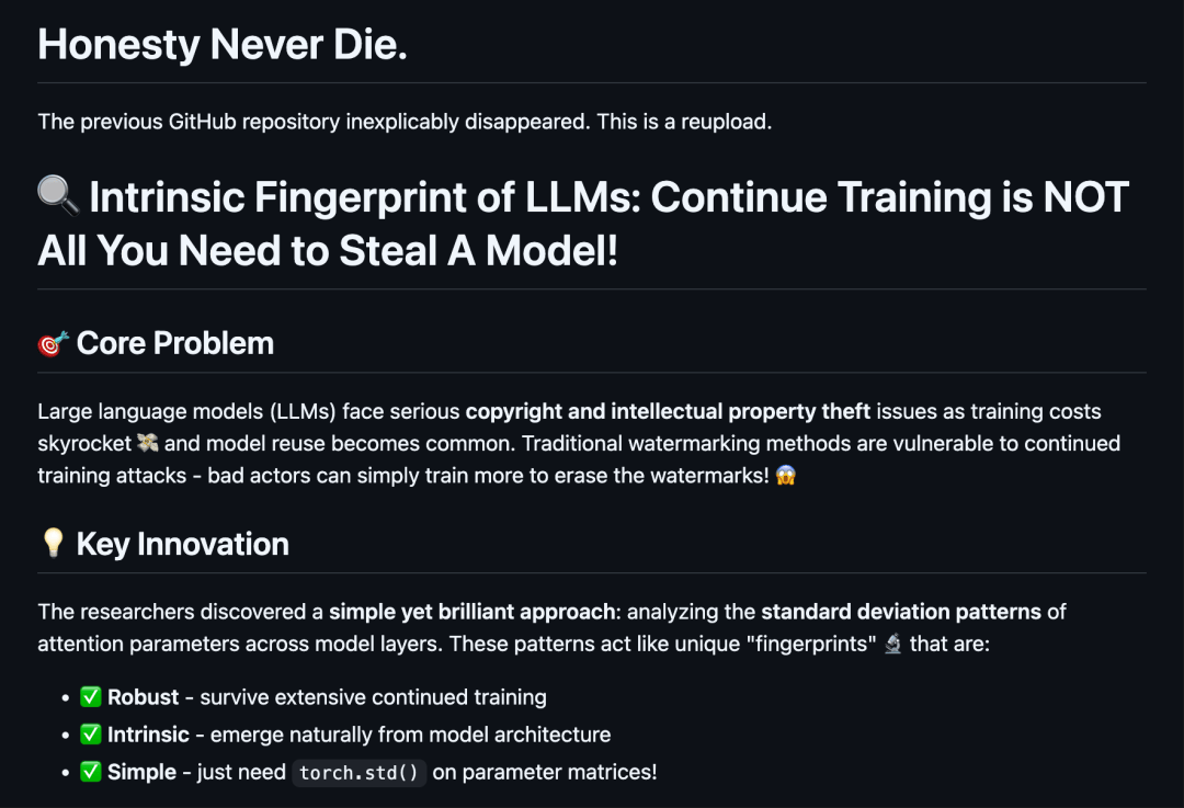 1、HonestyAGI GitHub:https://github.com/HonestyAGI/LLM-Fingerprint