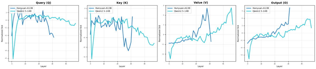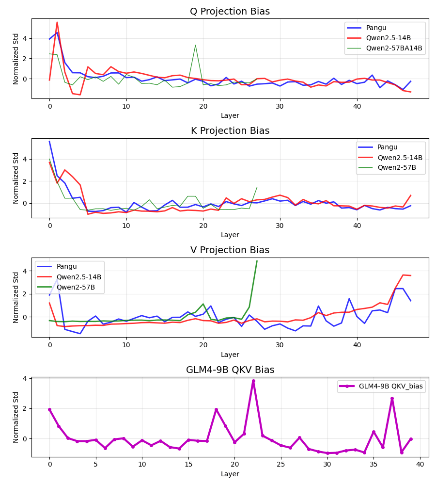 从结果来看,Pangu与Qwen2.5-14B的Q、K、V投影偏差模式几乎相同,早期层出现特征性峰值后收敛,而这个设计是Qwen 1-2.5代独有的特色,多数开源模型(包括Qwen3)已弃用。