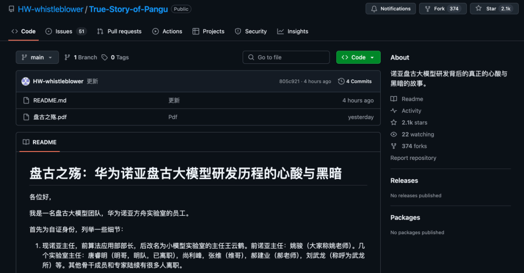 就在昨天,一篇名为《盘古之殇:华为诺亚盘古大模型研发历程的心酸与黑暗》的文章在GitHub上走红,仅一天时间便揽获2.5K Star(还在持续增长中)。