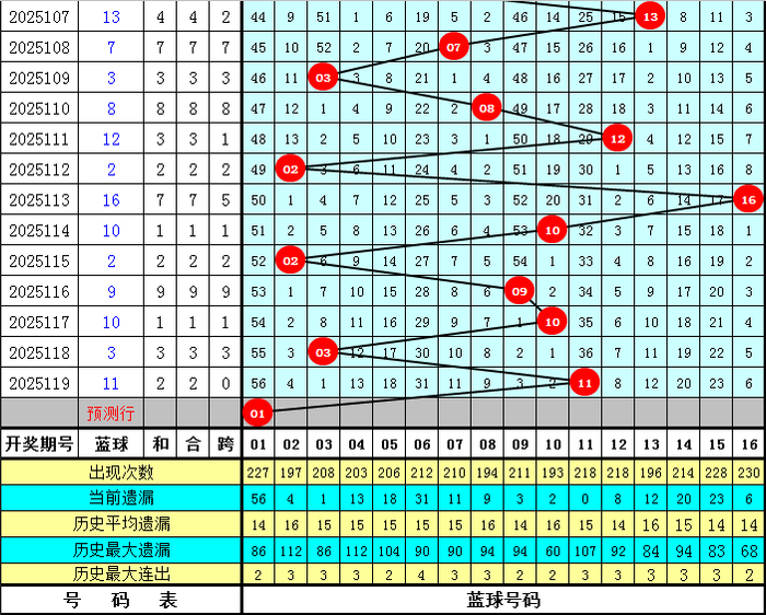蓝球分析:蓝球上期开出大号11,最近10期蓝球号码大小比为6:4,小 号蓝球出现较少,本期注意回补,看好蓝球01。